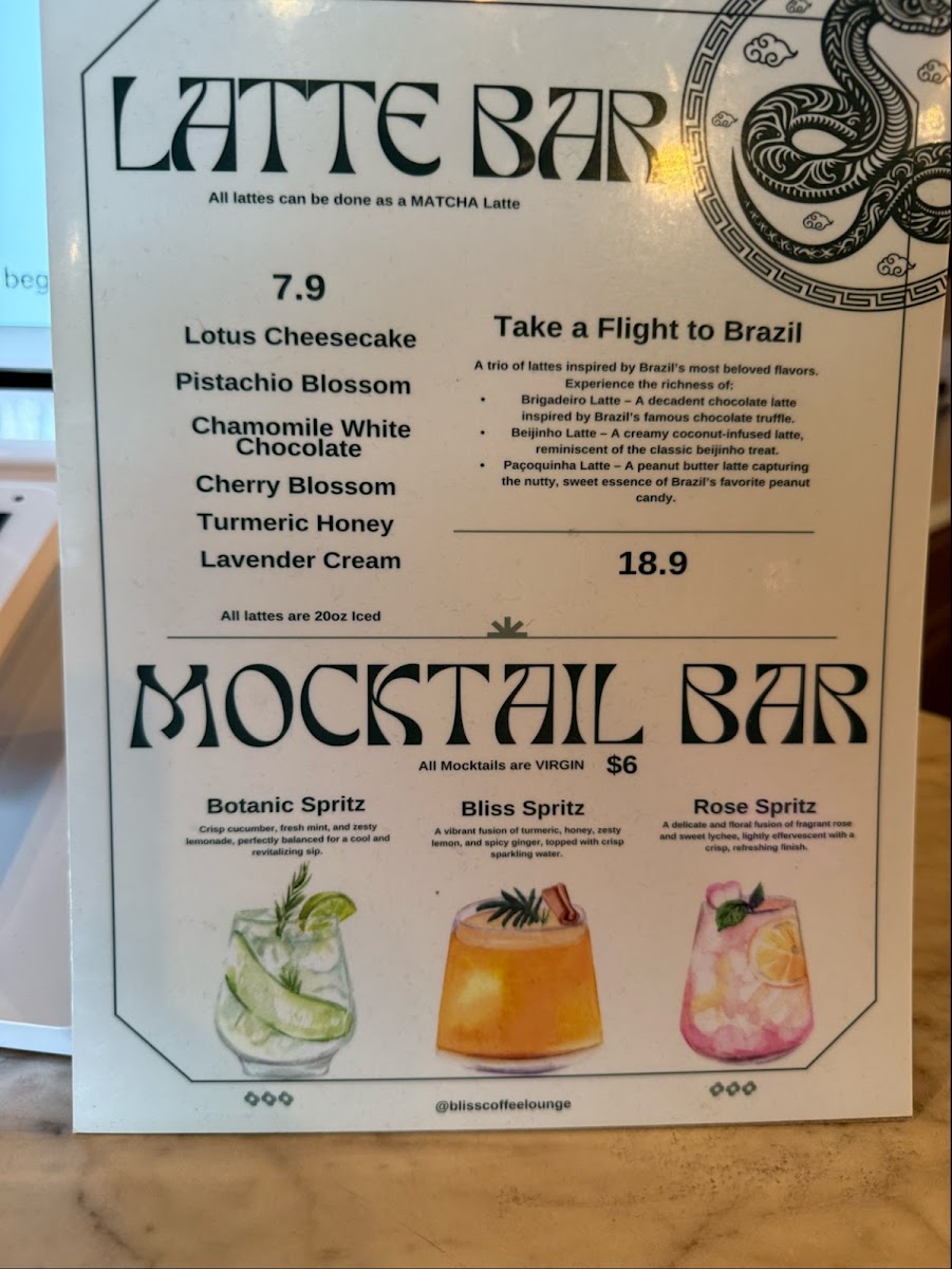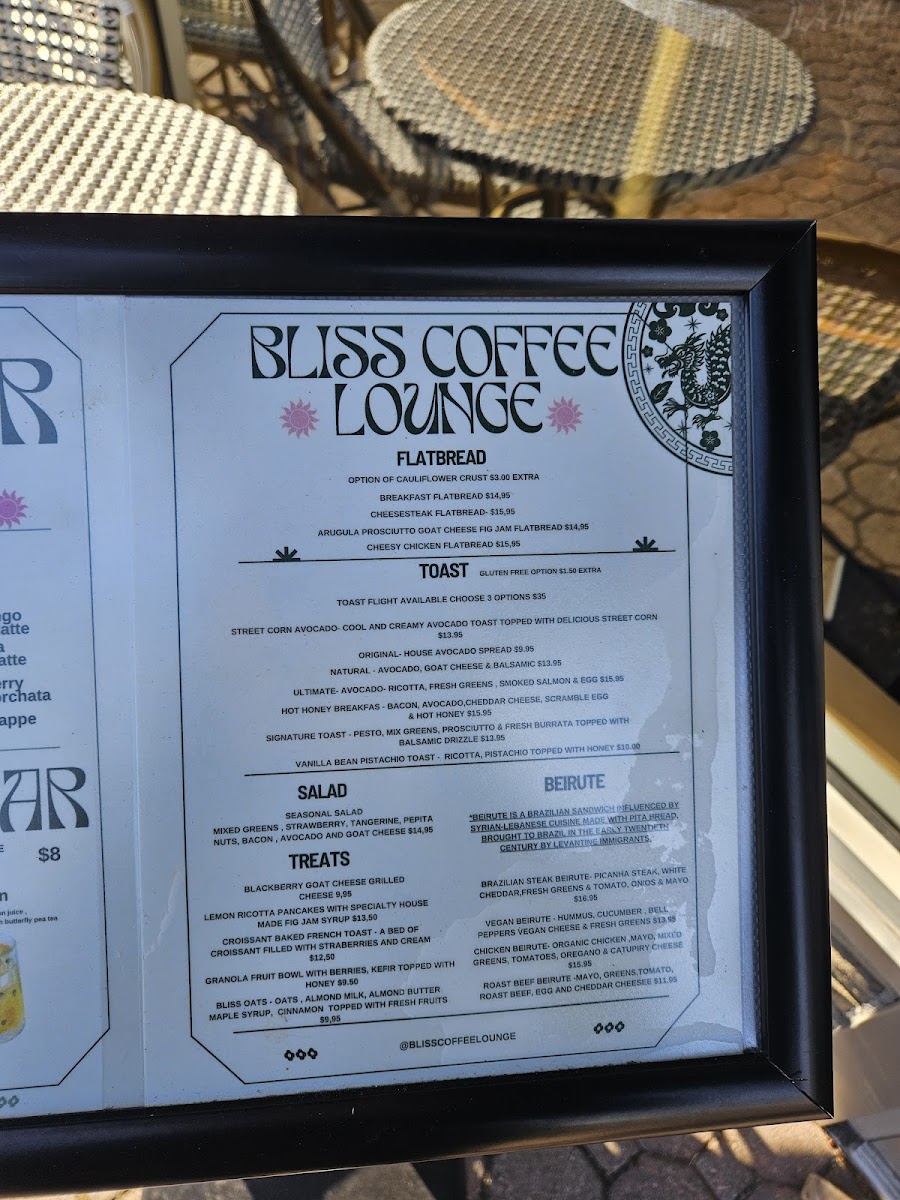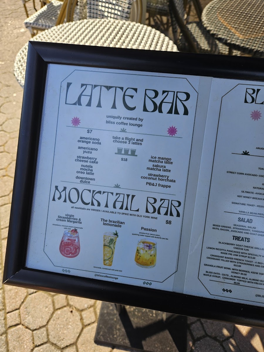 The menu at Bliss Coffee Lounge offers a curated selection of beverages and light food options suitable for breakfast, coffee breaks, or casual dining. Visitors can choose from a variety of coffee drinks including espresso-based options such as Cortado, Cappuccino, Tiramisu Latte, Biscoff Latte, Almond Milk Latte, Iced Coffee, Iced Caramel Macchiato, and specialized offerings like an Espresso Flight and Coffee Flight. Non-coffee alternatives such as teas and mocktails are also available.