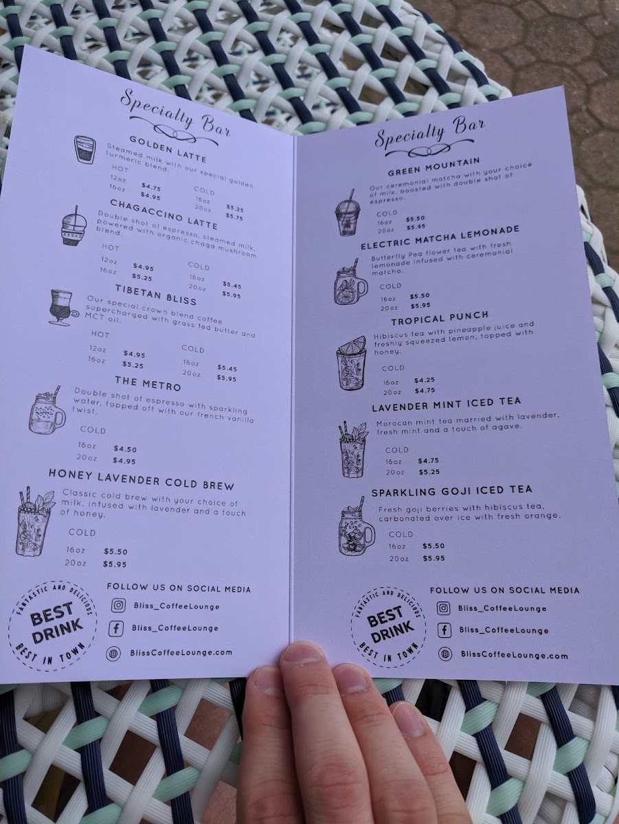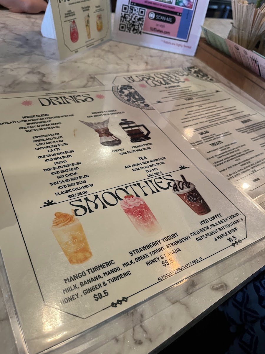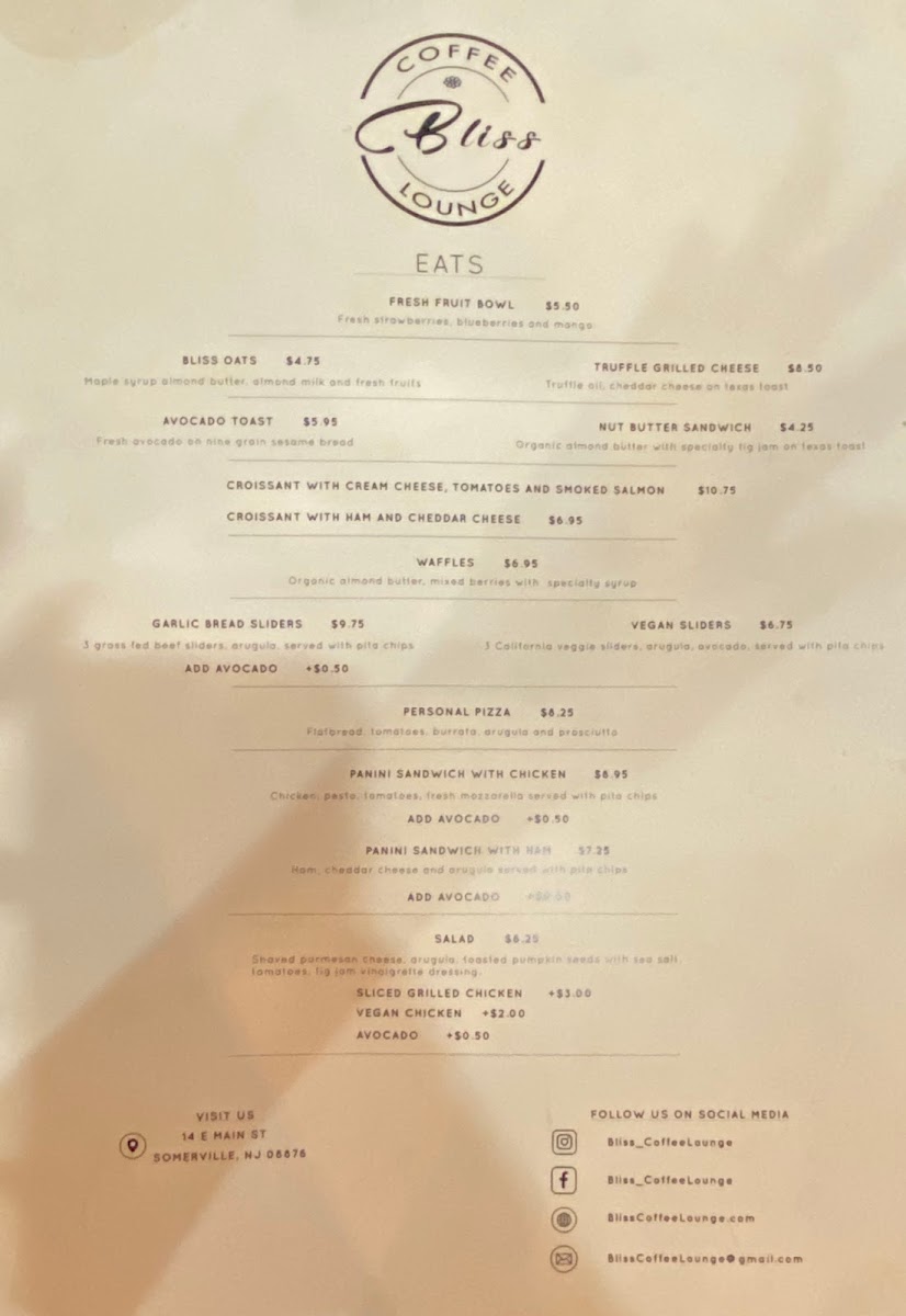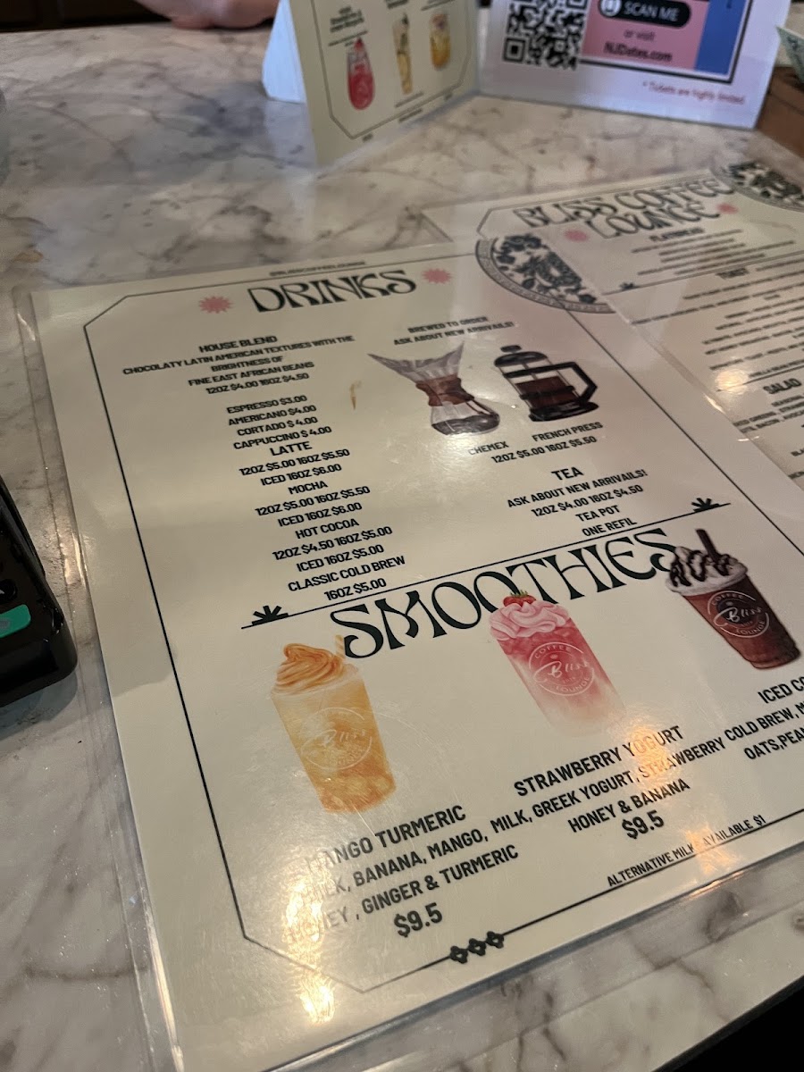 The menu at Bliss Coffee Lounge offers a curated selection of beverages and light food options suitable for breakfast, coffee breaks, or casual dining. Visitors can choose from a variety of coffee drinks including espresso-based options such as Cortado, Cappuccino, Tiramisu Latte, Biscoff Latte, Almond Milk Latte, Iced Coffee, Iced Caramel Macchiato, and specialized offerings like an Espresso Flight and Coffee Flight. Non-coffee alternatives such as teas and mocktails are also available.